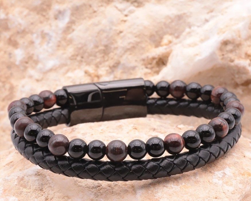 BRACELET ASKA CUIR NOIR OEIL DE TAUREAU, ONYX A