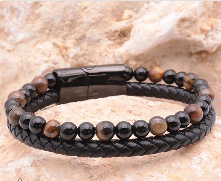 BRACELET ASKA CUIR NOIR OEIL DE TIGRE, ONYX A
